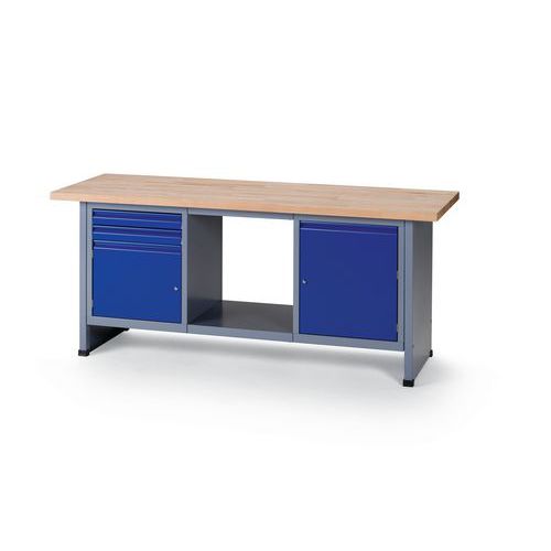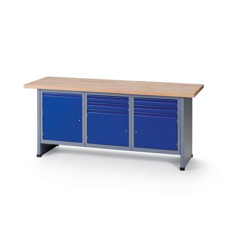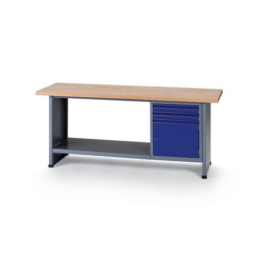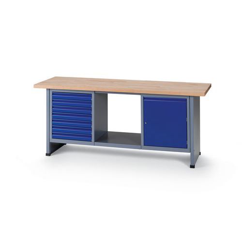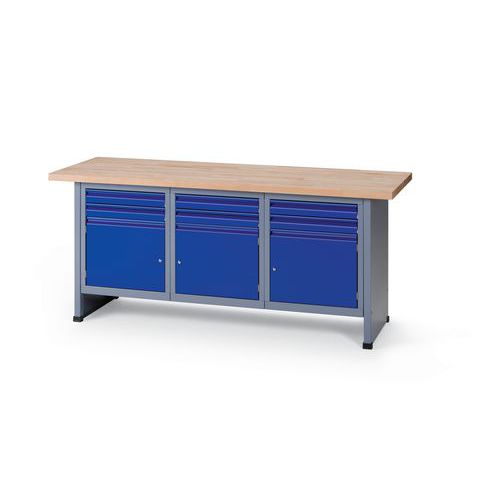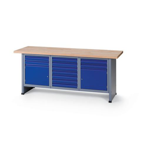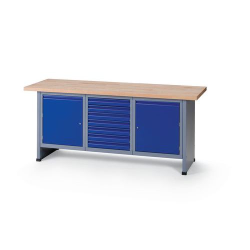 Robust og ekstra bred arbeidsbenk med plate av massiv bøk. Skuffene har rullelager, og dermed er det veldig enkelt å åpne og lukke dem. Dør med lås for trygg oppbevaring av eiendelene dine.