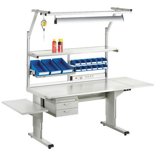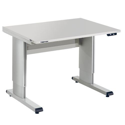 Treston WB arbeidsbenk er spesielt egnet for elektronikkindustrien og som verkstedbenk. Bordplaten kan justeres trinnløst, enten elektrisk eller med håndsveiv eller unbrakonøkkel. Takket være moduler for plassering over arbeidsbordet og et bredt utvalg av tilbehør og tilleggsprodukter, er det enkelt å skape en svært ergonomisk arbeidsplass. Arbeidsbordene i denne produktfamilien kan enkelt plasseres side ved side, rygg mot rygg eller mot en vegg i forskjellige formasjoner. Trinnløs høydejustering av bordplate 700–1100 mm Aluminiumsprofil med høy finish appellerer til øyet. Bordplate i laminat. Egnet for renrom med ISO klasse 7 Vi har også side- og hjørnemoduler for utvidelse Maks belastning 300 kg Finnes også med ESD-beskyttelse Kan enkelt plasseres rygg mot rygg, side ved side eller i et hjørne.