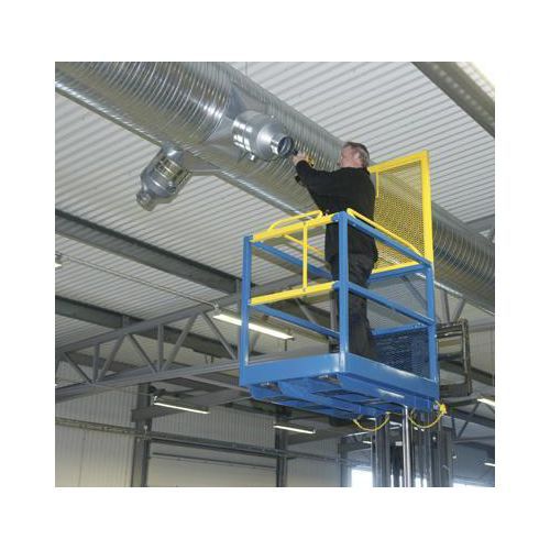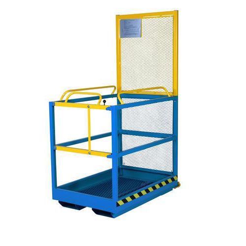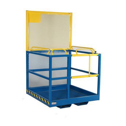 CE-merket arbeidskurv for sikre personløft. Utstyrt med sklisikkert gulv, doble sikkerhetskjeder til låsesplint og fjærende dobbeltvirkende lås i porten.