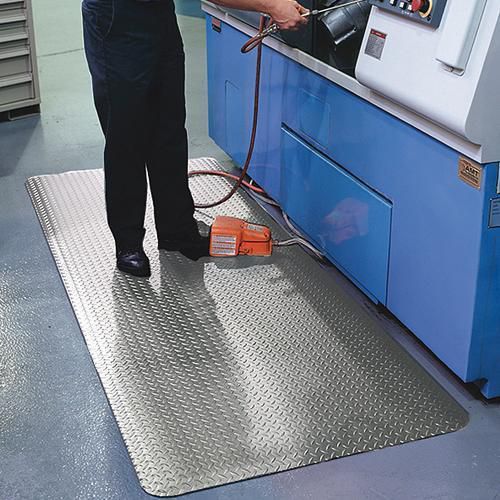 Svært slitesterk arbeidsplassmatte med dørkmønstret overflatesjikt for beste sklisikring selv ved væskesøl.
