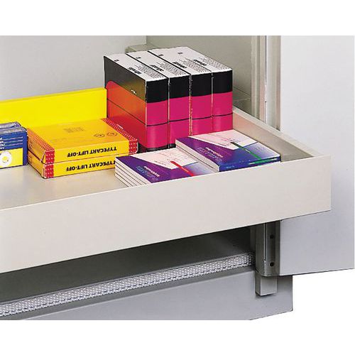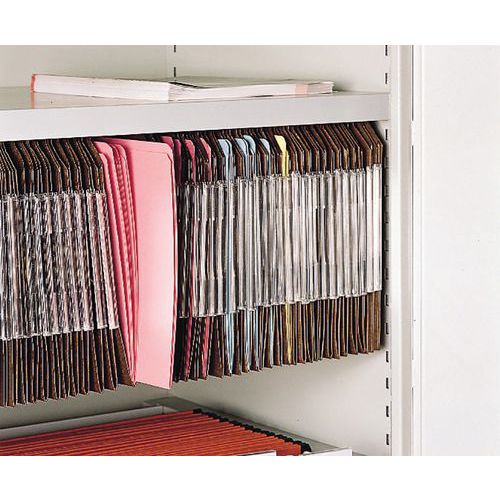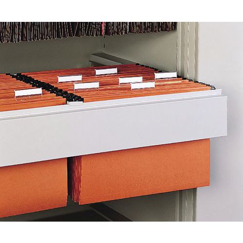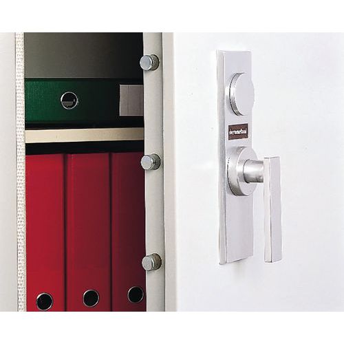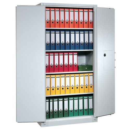 Brann- og innbrudssikkert arkivskap. Passer for oppbevaring av permer. Platene kan enkelt justeres i høyden. Lukk skapet på sikker måte takket være låsen med dobbelt nøkkelskjegg. Bestill separat et system for hengemapper for oppbevaring av dokumenter.
