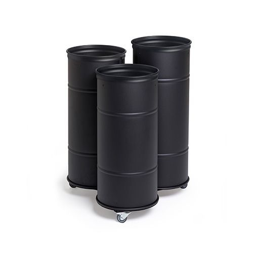 - Tønne i matt pulverlakkert stålplåt, med base på hjul for enkel flytting.