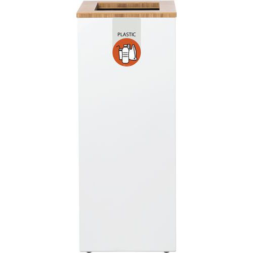 En avfallsoppsamlingsenhet i galvanisert stål med en stilig og slitesterk åpen topp av bambus med farget fraksjonsindikasjon og etikett.