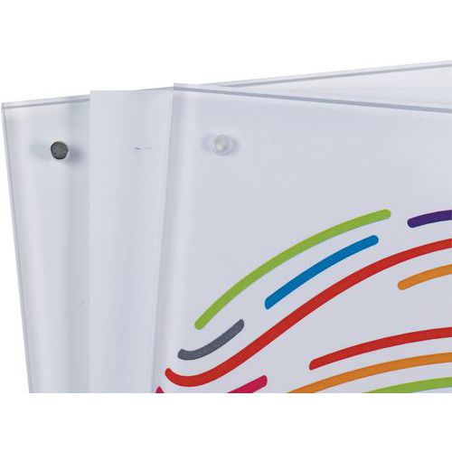 Gjennomsiktig bilderamme eller plakatholder med magnetisk lukking. Sett inn dokumentet eller bildet mellom de 2 magnetiske pleksiglasspanelene. Lukkes med 8 kraftige knappemagneter plassert i hver av de 4 hjørnene. Kan stilles opp i stående eller liggende, eller legges flat.