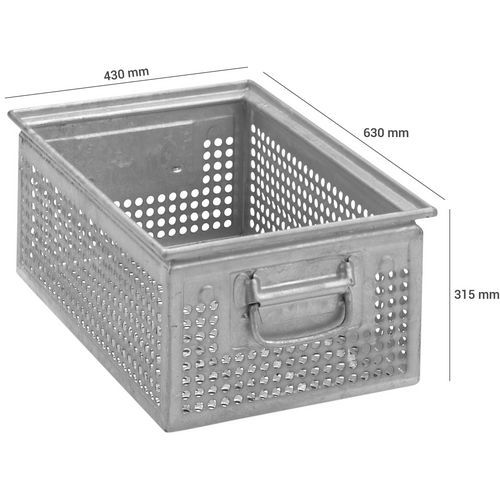 Boks metall perforert, Volum: 77 L, Totalhøyde: 315 mm, Totalbredde: 430 mm, Totallengde: 630 mm, Farge: Grå Boks metall perforert, Volum: 77 L, Totalhøyde: 315 mm, Totalbredde: 430 mm, Totallengde: 630 mm, Farge: Grå