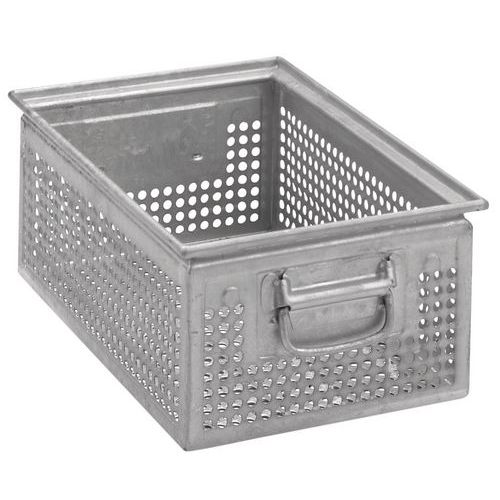 Innholdet er godt synlig gjennom perforeringen. Meget god stabilitet takket være forsterkningslister. Mister ikke formen takket være den kraftige stålkonstruksjonen. Kan stables i flere lag. Kasse for transport av metall.