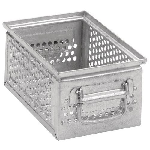 Innholdet er godt synlig gjennom perforeringen. Meget god stabilitet takket være forsterkningslister. Mister ikke formen takket være den kraftige stålkonstruksjonen. Kan stables i flere lag. Kasse for transport av metall.
