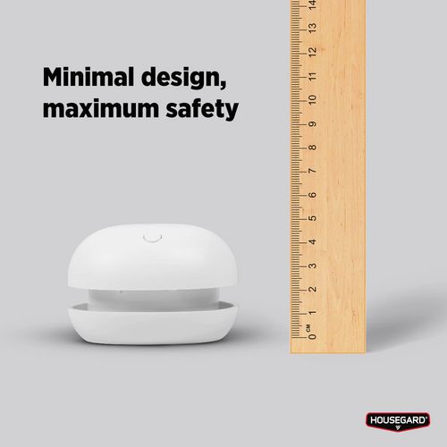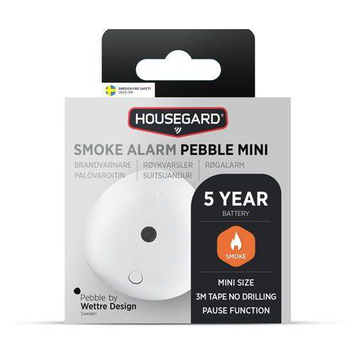 - Housegard Pebble Mini er en kompakt brannvarsler (optisk deteksjonskammer) med en diameter på kun 67 mm, noe som gjør den diskret og lett å plassere.