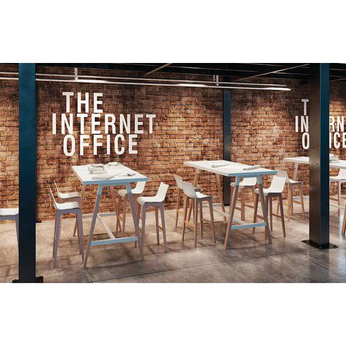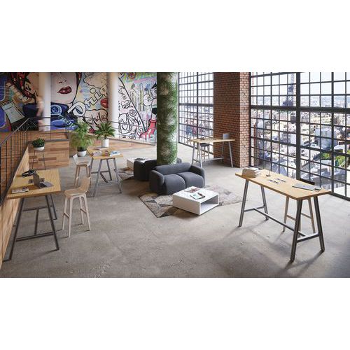 Cohesion høye bord er flotte å arbeide ved mens man står, og fine for å diskutere og samarbeide ved. Sammen med bordplatens naturlige finish kan du velge mellom trapesformede ben i metall og tre for å lage enten et industrielt eller naturlig utseende. Støtsikre ABS-kanter på 2 mm.