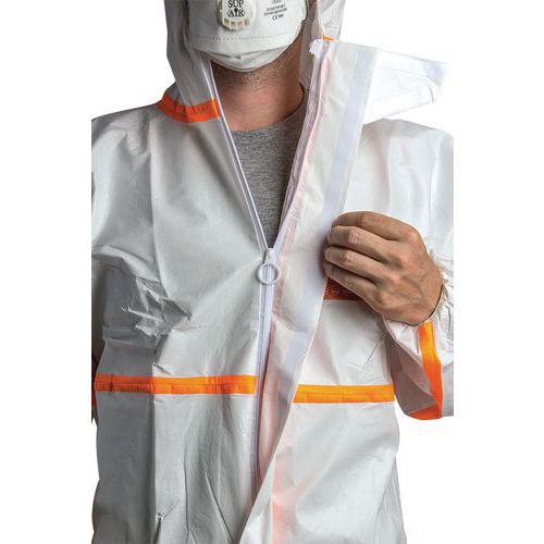 Passer til effektiv beskyttelse mot radioaktive urenheter i partikkelform. Stiftede sømmer, tapet over med en oransje varmebundet strimmel for maksimal beskyttelse. Strikk nede på bena og ermene for å hindre at klærne glir opp når brukeren beveger seg. Midje, mansjetter og ankler med strikk. Glidelåslukking med tapeklaff. Silikonfri antistatisk dress. Fremstilt av laminert mikroporøs film. Elastisk hette i tre deler. Hakestropp.