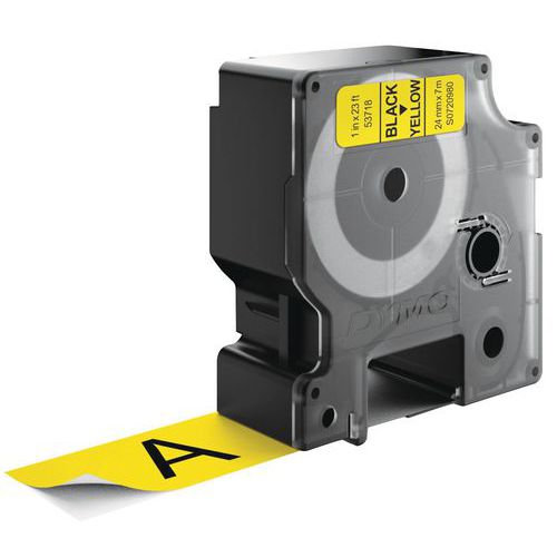 - Dymo D1 kassett med selvklebende polyestertape, svært slitesterk bakside.