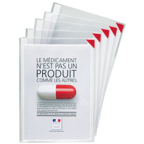 Perfekt for visning av dokumenter på glassvegger og i utstillingsvinduer (gjennomsiktig på begge sider). Beskytter overflatene: Tape, nåler eller stifter trengs ikke, så det blir ingen hull. Forbedrer bedriftens omdømme: Dokumentene får en fin presentasjon. Magnetisk lukking av hjørner. 2 selvklebende strimler på baksiden. Til stående eller liggende bruk. Kan holde opptil ti 80 g papirark.