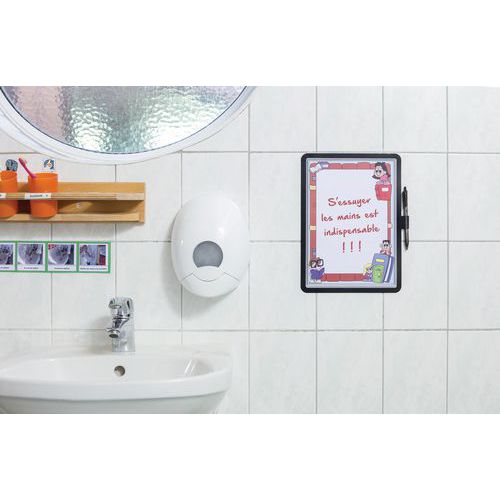Merk, reposisjonerbart klebemiddel for visning på alle glatte og rene overflater (kan fjernes og festes igjen uten å etterlate merker). Kan holde opptil 5 ark på 80 g/m² hver.