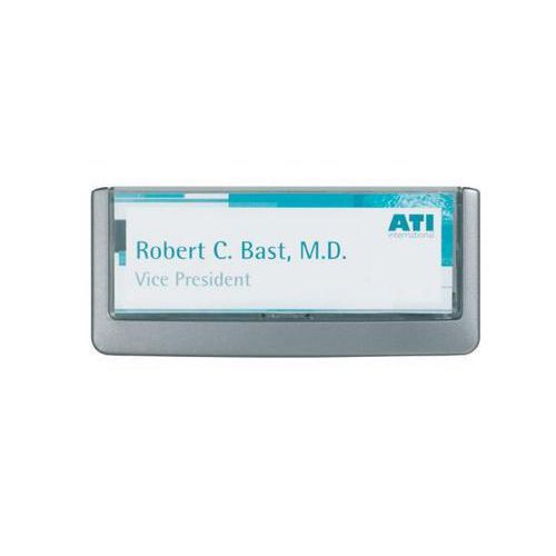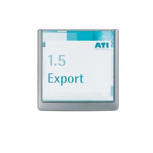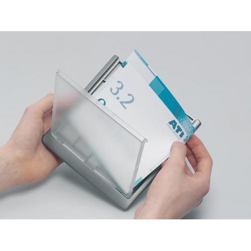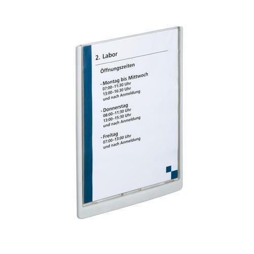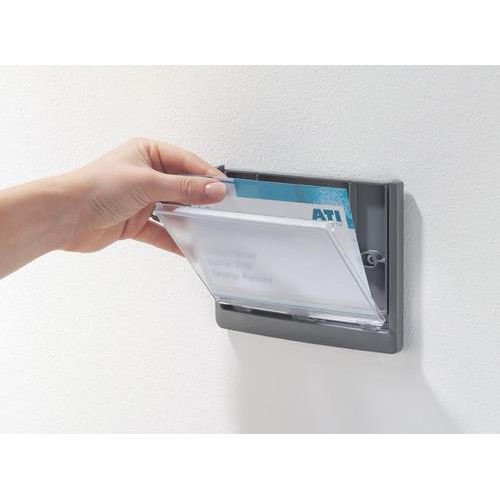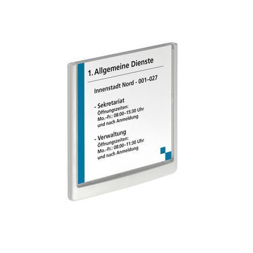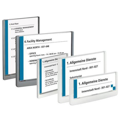 Stilrent skilt med frontskive av transparent akryl og bakstykke av ABS-plast. Skrus fast eller festes med festeputer (skrue, plugg og festeputer følger med). Maler for utskrift av innholdet kan lastes ned fra Internett: www.durable.se.