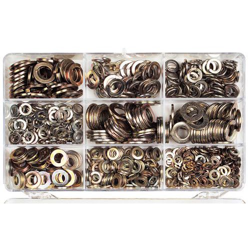 | Varenavn | Eske med flate underlagsskiver og nebbløse elastiske skiver, Materiale: Stål, Antall deler: 630, Modell: Eske |