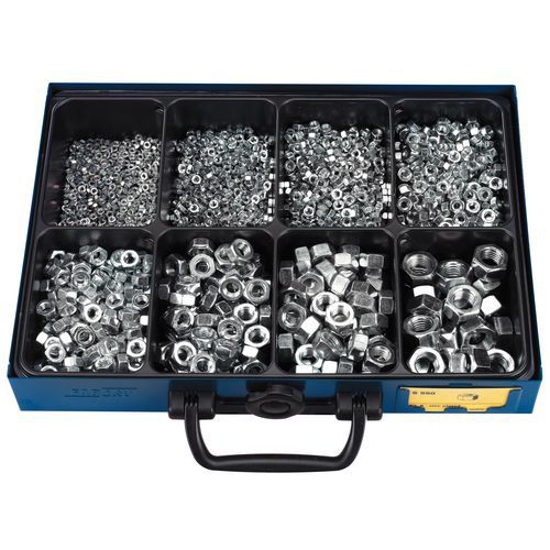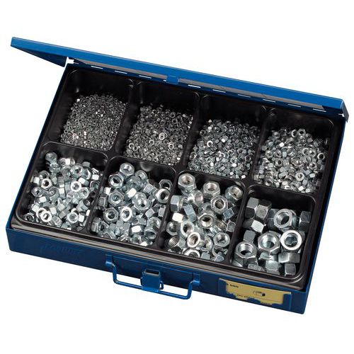 | Varenavn | Eske med sekskantmuttere i stål, Materiale: Stål, Antall deler: 2200, Modell: Eske |
