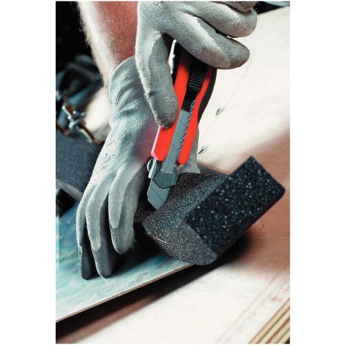 | Varenavn | Kniv med bryteblad, bladbredde 18 mm, Blad, materiale: Rustfritt stål, Bruk: Kappe, Hus, materiale: ABS |