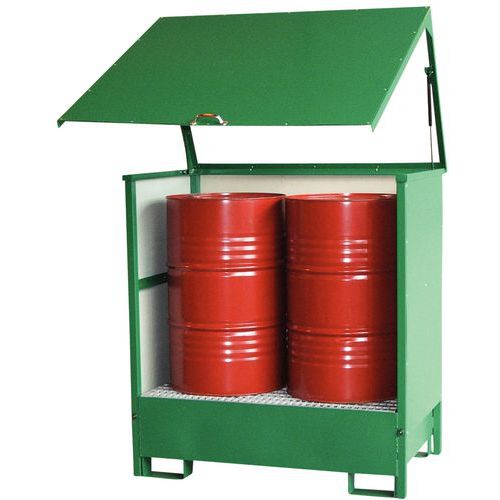 - Allsidig løsning som muliggjør sikker lagring av 4 fat (220 liter) eller 1 IBC-tank (1000 liter).