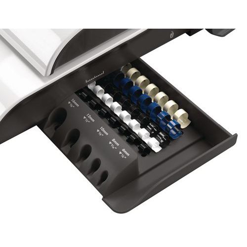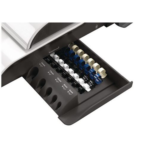 Enkel binding med de skrå ringstøttetennene Justerbar kantlinje for nøyaktig justering av alle dokumenter Oppbevaringsskuff med skuff for innbindinger og dokumenter Skuffen med hullavklipp åpnes automatisk for å forhindre papirstopp Innbindingskapasitet på 300 sider med rygg med maks dimensjon 38 mm. Stanser og binder inn