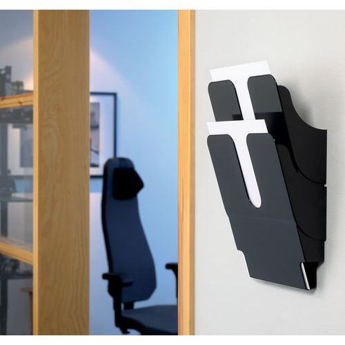 Elegant veggoppbevaring for dokumenter opp til 24 x 32 cm i størrelse. Kan monteres separat eller som en gruppe: Rommene kan enten henges opp på egen hånd, eller ved siden av eller oppå hverandre. Pen finish for å fremheve informasjon i offentlige resepsjonsområder. V-åpning for utmerket grep av små dokumenter.