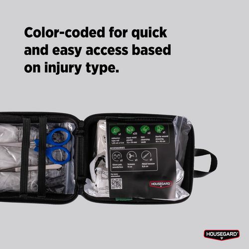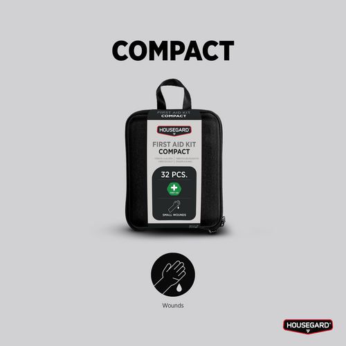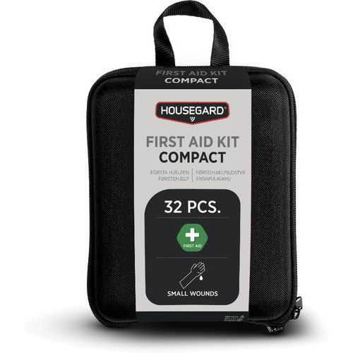 - Housegard Compact er et lite og praktisk førstehjelpssett for behandling av små sår og skader.