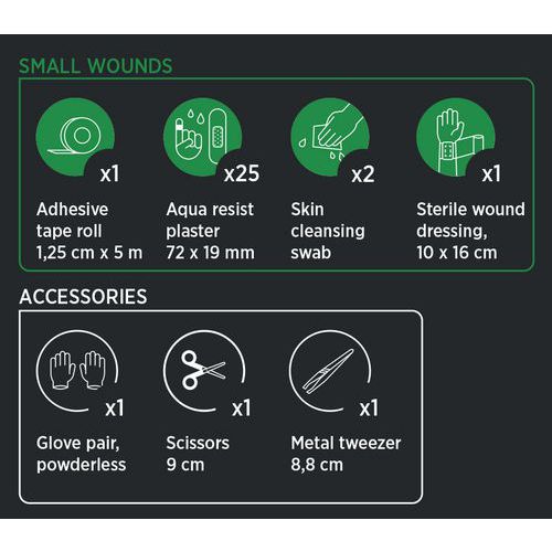 - Inneholder 32 deler blant annet plaster, sårservietter, saks, pinsett og hansker.