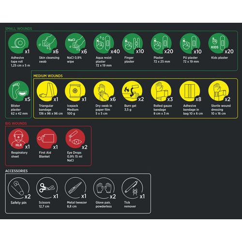 | Varenavn | Førstehjelpsveske, Premium, Farge: Svart, Bredde: 335 mm, Lengder: 230 mm, Dybde: 85 mm |