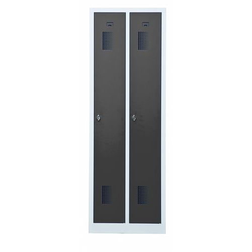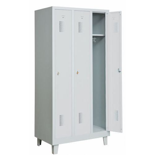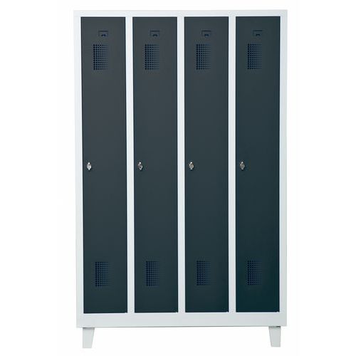 Garderobeskap med én, to, tre eller fire dører. Låsing med hengelås. Overflaten er pulverlakkert med en slitesterk strukturlakk som beskytter mot slitasje. Skapet er designet med en sokkelkant i bunnen, noe som gjør det fleksibelt å plassere direkte på gulvet, på benstativ eller kombinert med en sittebenk. Perfekt alternativ for både garderober og korridorer.