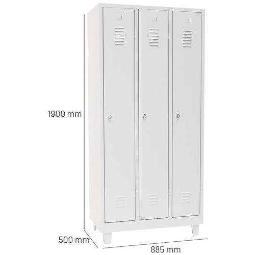 Garderobeskap Classic 300 med ben, et svært robust garderobeskap, utstyrt med dører som er forsterket med usynlige hengsler og har en optimal åpning på 180 grader. Friske og hygieniske: ventilasjon øverst og nederst på kleskapsdørene. Skapene har hull til å feste i vegg, for en sikker installasjon. Hvert garderobeskap Classic 300 består av 1 hylle, 1 stang og 1 krok. Stemplet etikettholder.