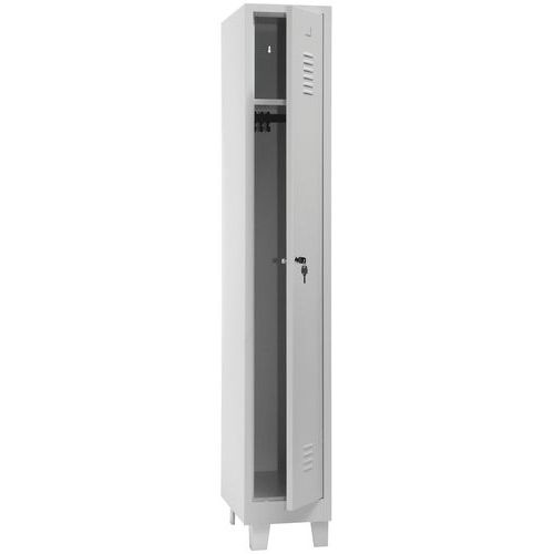Garderobeskap Classic 300 med ben, et svært robust garderobeskap, utstyrt med dører som er forsterket med usynlige hengsler og har en optimal åpning på 180 grader. Friske og hygieniske: ventilasjon øverst og nederst på kleskapsdørene. Skapene har hull til å feste i vegg, for en sikker installasjon. Hvert garderobeskap Classic 300 består av 1 hylle, 1 stang og 1 krok. Stemplet etikettholder. Plate, tykkelse : 7/10e Dørtykkelse : 7/10e Garanti (år) : 10 år