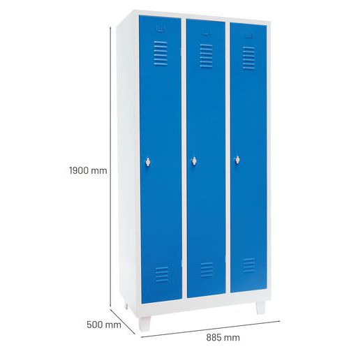 Garderobeskap Classic 300 med ben, et svært robust garderobeskap, utstyrt med dører som er forsterket med usynlige hengsler og har en optimal åpning på 180 grader. Friske og hygieniske: ventilasjon øverst og nederst på kleskapsdørene. Skapene har hull til å feste i vegg, for en sikker installasjon. Hvert garderobeskap Classic 300 består av 1 hylle, 1 stang og 1 krok. Stemplet etikettholder. Dørtykkelse : 7/10e Garanti (år) : 10 år Plate, tykkelse : 7/10e