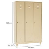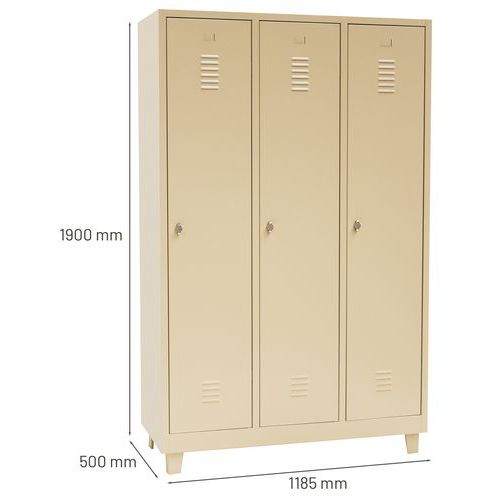 Dører som er forsterket med usynlige hengsler. Optimal åpning på 180°. Hygienisk: ventilasjon øverst og nederst på garderobedørene. 1 skillevegg for rene og skitne klær. 1 hylle, 1 stang og 2 kroker per rom, hull for veggmontering og etikett-holder. Garanti (år) : 10 år Plate, tykkelse : 7/10e