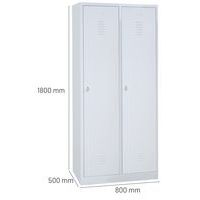 Dører som er forsterket med usynlige hengsler. Optimal åpning på 180°. Hygienisk: ventilasjon øverst og nederst på garderobedørene. 1 skillevegg for rene og skitne klær. 1 hylle, 1 stang og 2 kroker per rom, hull for veggmontering og etikett-holder.