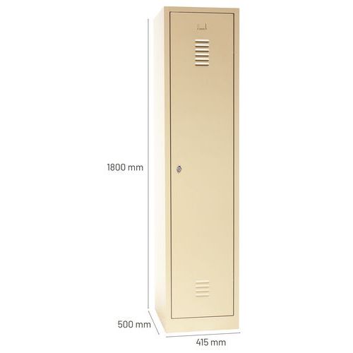 Dører som er forsterket med usynlige hengsler. Optimal åpning på 180°. Hygienisk: ventilasjon øverst og nederst på garderobedørene. 1 skillevegg for rene og skitne klær. 1 hylle, 1 stang og 2 kroker per rom, hull for veggmontering og etikett-holder. Plate, tykkelse : 7/10e Garanti (år) : 10 år