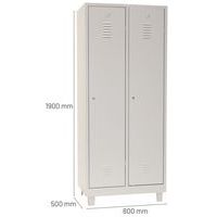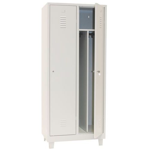 Dører som er forsterket med usynlige hengsler. Optimal åpning på 180°. Hygienisk: ventilasjon øverst og nederst på garderobedørene. 1 skillevegg for rene og skitne klær. 1 hylle, 1 stang og 2 kroker per rom, hull for veggmontering og etikett-holder.