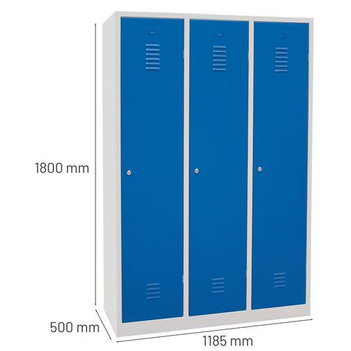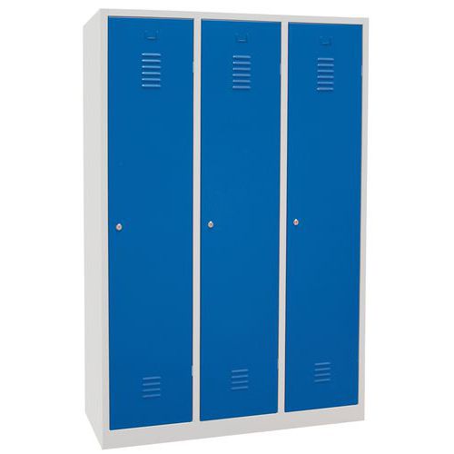 Dører som er forsterket med usynlige hengsler. Optimal åpning på 180°. Hygienisk: ventilasjon øverst og nederst på garderobedørene. 1 skillevegg for rene og skitne klær. 1 hylle, 1 stang og 2 kroker per rom, hull for veggmontering og etikett-holder. Garanti (år) : 10 år Plate, tykkelse : 7/10e