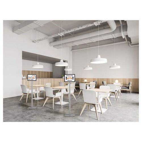 INFO STAND BASIC fra Durable er et gulvskilt med dobbeltsidig lesbarhet som passer for tydelig informasjonsvisning samt veiledning i resepsjoner, lobbyer, venterom og på messer.