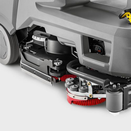 - Maskinen har et 75 cm skurehode samt sideaggregat som muliggjør rengjøring nær kanter og under utstikkende objekter.