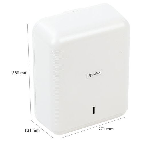 | Varenavn | Håndkledispenser, Farge: Hvit, Høyde: 360 mm, Bredde: 271 mm, Dybde: 131 mm |