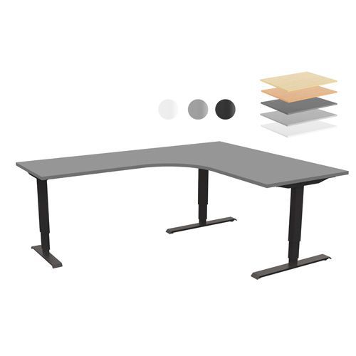 Funksjonelt og slitesterkt skrivebord, tilpasset de vanligste behovene innen kontorarbeid. Den buede bordplaten er 25 mm tykk og laget av slitesterkt laminat der farge og struktur ikke påvirkes av sollys eller regelmessig avtørking. Stabilt og stillegående elektrisk understell i moderne design. Lagd av sølvlakkert stål. Leveres umontert. Maksimal belastning: 100 kg. Bredde: 1600/1800/2000/600 mm. Dybde: 800/2000 mm.