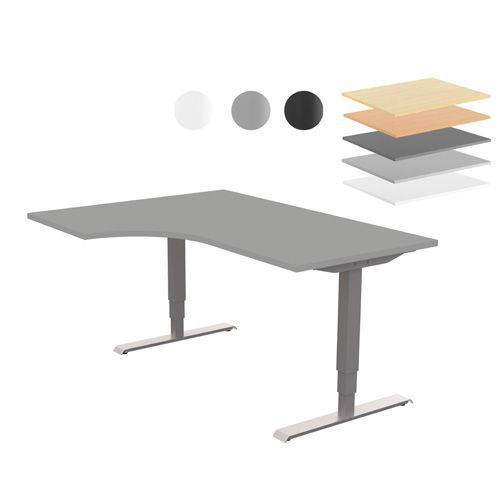 Funksjonelt og slitesterkt skrivebord, tilpasset de vanligste behovene innen kontorarbeid. Den buede bordplaten er 25 mm tykk og laget av slitesterkt laminat der farge og struktur ikke påvirkes av sollys eller regelmessig avtørking. Stabilt og stillegående elektrisk understell i moderne design. Lagd av sølvlakkert stål. Leveres umontert. Maksimal belastning: 100 kg. Bredde: 1600/1800/2000/600 mm. Dybde: 800/1200 mm.