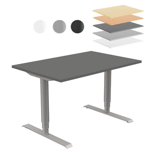 Funksjonelt og slitesterkt skrivebord, tilpasset de vanligste behovene innen kontorarbeid. Den rektangulære bordplaten har avfaset kant og er 25 mm tykk. Den er laget av MDF-plate belagt med melanin. Farge og struktur påvirkes ikke av sollys eller regelmessig avtørking. Stabilt og stillegående elektrisk understell i moderne design. Lagd av sølvlakkert stål. Leveres umontert. Maksimal belastning: 100 kg.