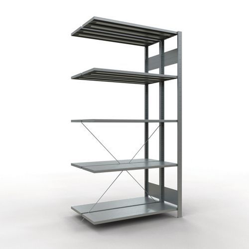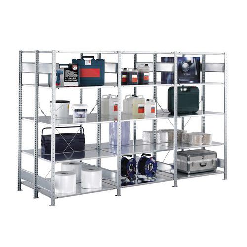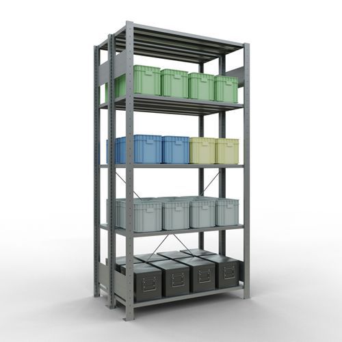 - Grunnseksjon: består av 8 stolper, 10 hylleplater, 8 forsterkninger og 1 kryss med tilhørende spenner. Enkel og rask montering. Lett å bygge ut.