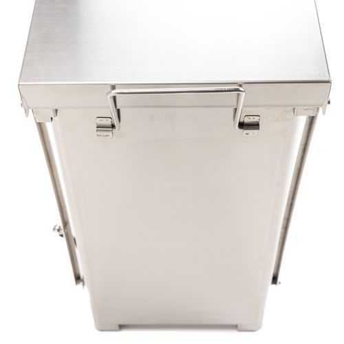 Denne robuste avfallsbeholderen i rustfritt stål åpnes med fotpedal og er både brann- og værbestandig.