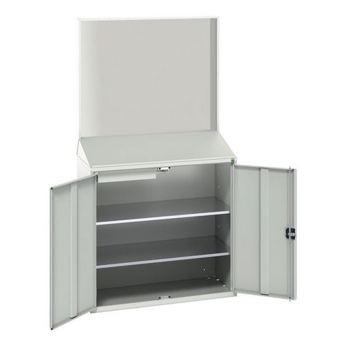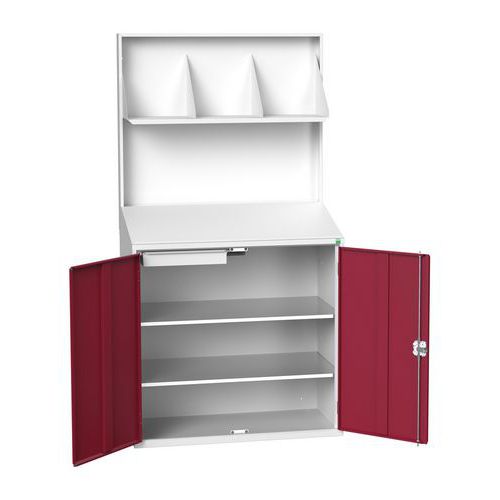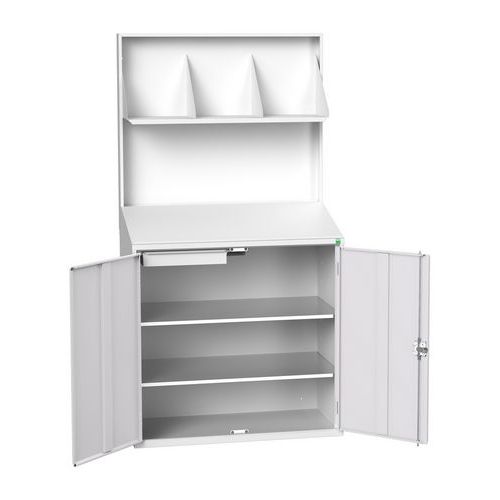 Konsultasjonsstasjon utstyrt med bakpanel og høy hylle. Skrånende skriveflate. Underskap utstyrt med 2 hyller i galvanisert stål og 1 skuff. Forsterkede doble dører og integrerte håndtak. Låsbar.