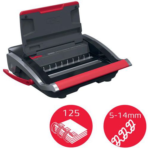 - Maskinen kan stanse opptil 15 ark 80 g/m²-papir om gangen og binde opptil 125 ark med 14 mm trådspiraler.