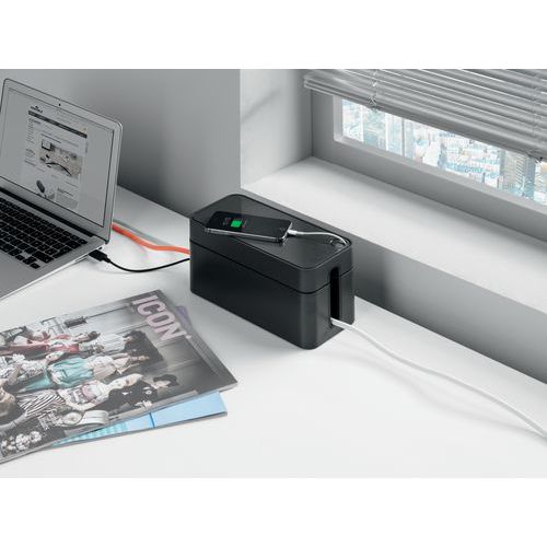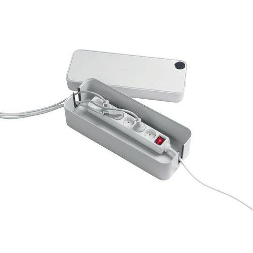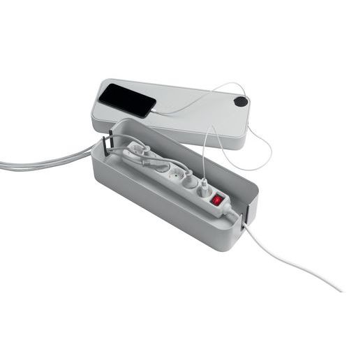 Elegant kabelboks i flammesikker plast for kabler og grenuttak. Gummikledde åpninger for kabler på begge kortsidene. Åpningene fungerer også som ventilasjonshull. Lokk med praktisk kabelgjennomføring for mobilens ladekabel. Store gummiføtter gjør at kabelboksen står stødig. Få orden på kablene med CAVOLINE både på kontoret og hjemme. Samle kablene slik at det blir ryddigere og enklere å rengjøre.
