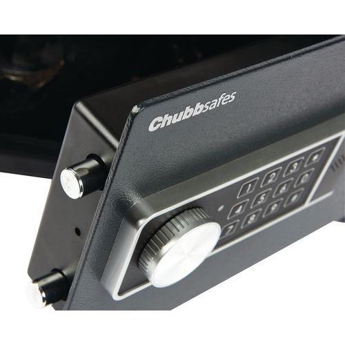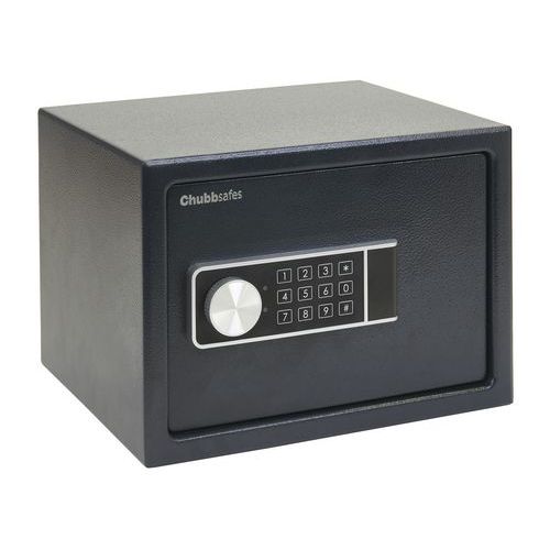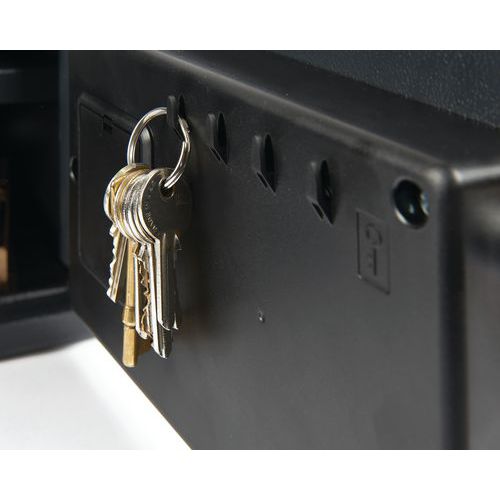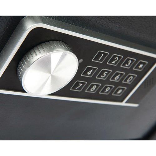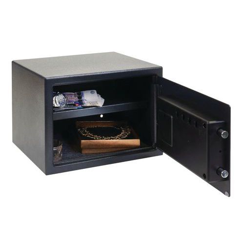Utside av stål, og luke av massivt stål. Lås med to forkrommede bolter. Festehull under og på baksiden. Med elektronisk lås: programmering av en kode (3 til 8 tall) og sikkerhetskode. Blokkering etter 3 feil koder. Batteriindikator.