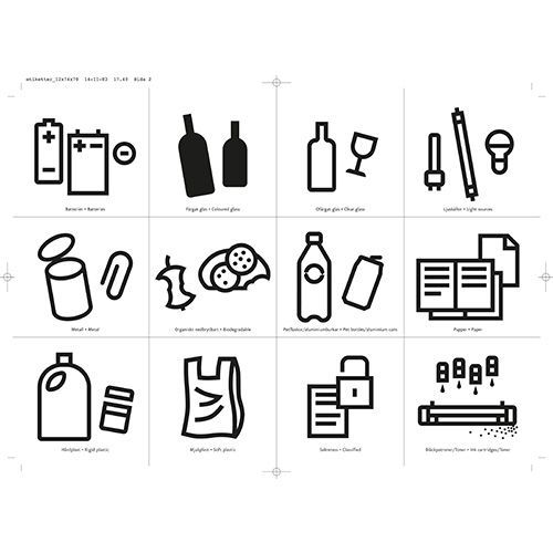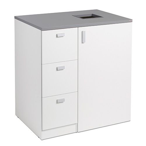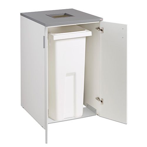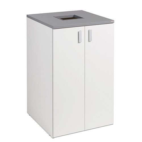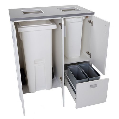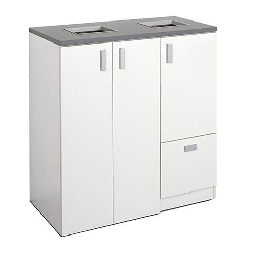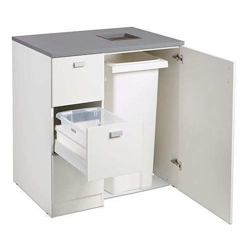 Stillig serie av gjennvinningsprodukter som dekker små og store behov. Produsert i hvit laminat med grå benkeplate og håndtak i aluminium. Avfallshull 250 x 250 mm med metallramme. 1 ark med 12 sorteringssymboler følger med. Leveres ferdigmontert.