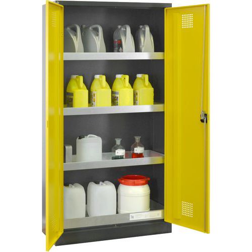 Kjemikalieskap CS Eco P - for sikker og regelmessig oppbevaring av ikke-brennbare farlige stoffer og kjemikalier i arbeidsområder. Enkelveggskonstruksjon, laget av høykvalitets pulverlakkert stålplate i RAL 7016 - antrasittgrå, dør(er) i RAL 1018 - sinkgul. Dør med sentralt sylindrlås. Ventilasjonsåpninger i døren. Brickformede hyller, tippesikre, maksimal belastning 50 kg per hylle. Hyllene er høydejusterbare i intervaller på 20 mm for fleksibel bruk av skapet etter eget behov. DN 80-ventilasjonskobling for avtrekk på skapets tak. Hyllene og oppsamlingskaret for bunnen er laget av galvanisert stålplate, WHG - Ü-merke i henhold til StawaR.